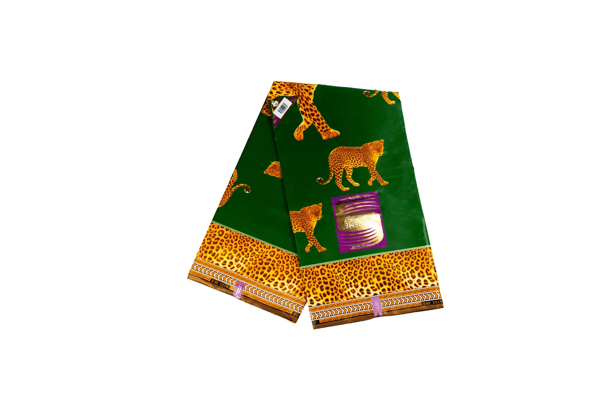 Dieser auffällige afrikanische Wax Print Stoff kombiniert einen kräftigen grünen Hintergrund mit detailreichen Leopardenmotiven in warmen Gold- und Brauntönen. Die markante, gelb-orangefarbene Animal-Print-Bordüre verleiht dem Design einen luxuriösen und ausdrucksstarken Charakter – perfekt für einzigartige Gewänder, festliche Mode oder kreative Designerstücke.